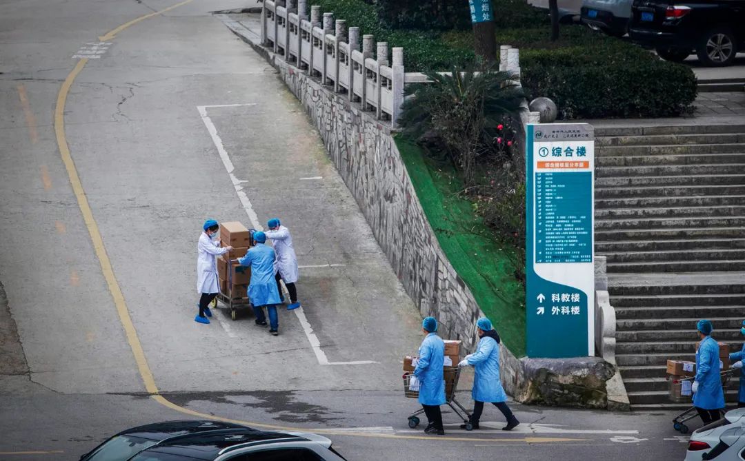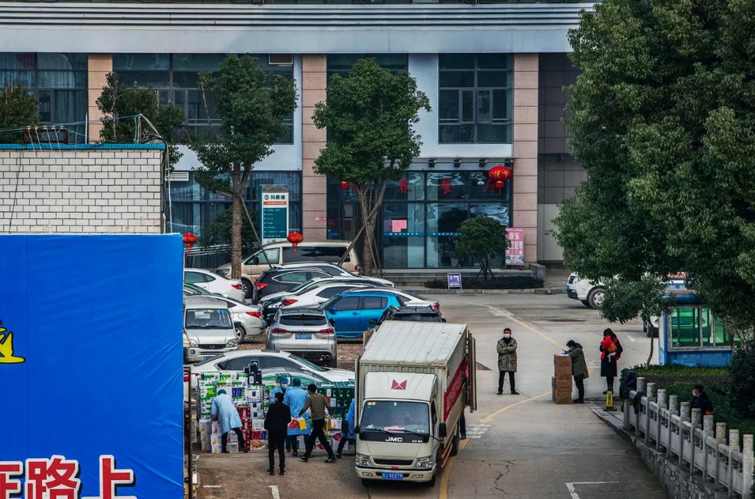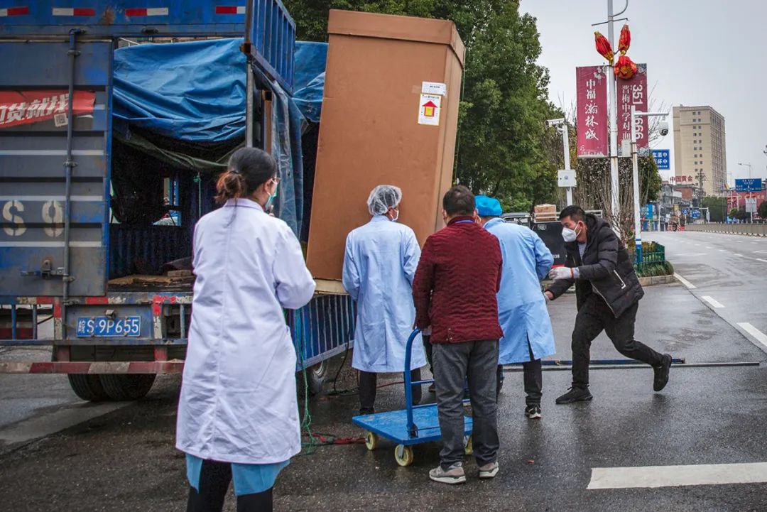 2020年2月10日,志愿者们在院内帮助搬运货物。医院的抗疫得到社会各界人士的支持。这8位志愿者一直在医院搬运、分发货物,县义工爱心协会一直在为工作人员和病人作快餐,每天从200-500份都送到各个隔离治疗点,有力地减轻了医院自身食堂的压力。