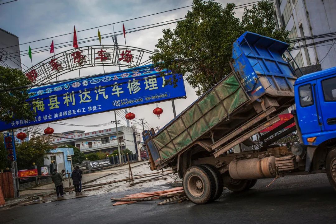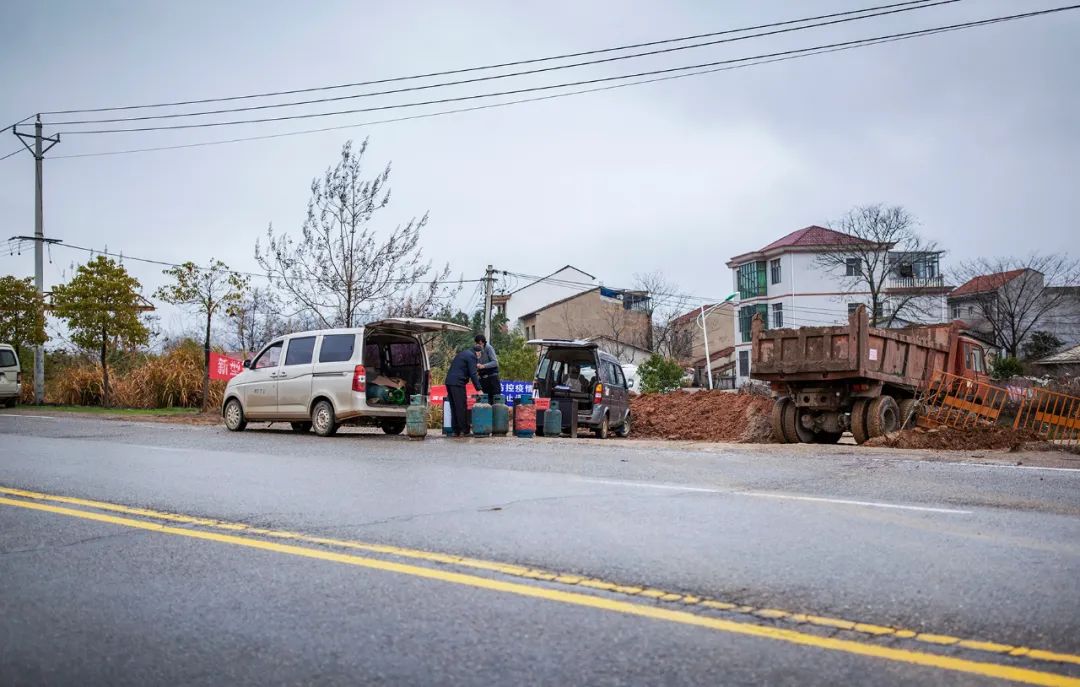 2020年2月11日,我去雷焱山应急医院参加交接仪式途中所见,村民在路口接收购买的煤气罐。