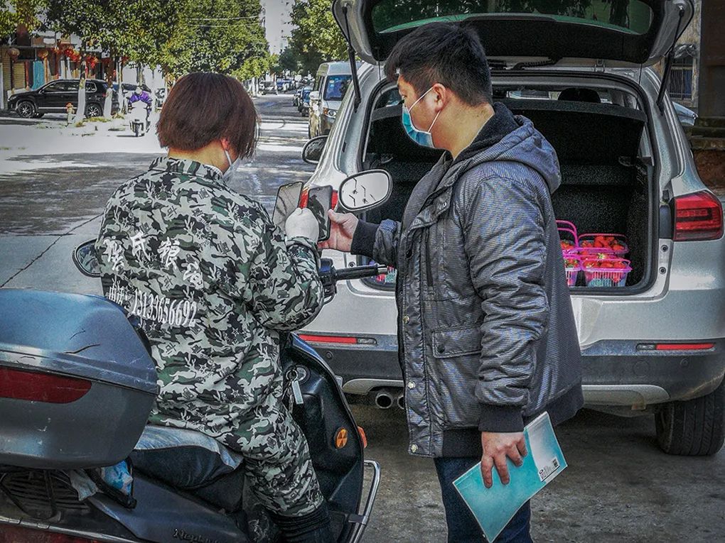 2020年2月12日,路遇买草莓的专车,对客户说只接受微信上预订,所以这位女士在扫卖家的微信。