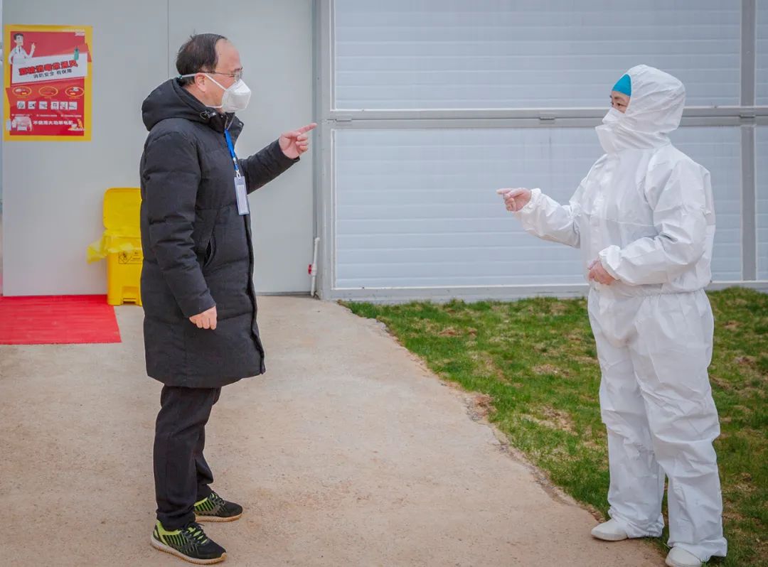 2020年3月6日,奋战在雷焱山院区里的一对夫妻在交流。此次抗疫战中,我院有9对夫妻同时在一线战斗。
