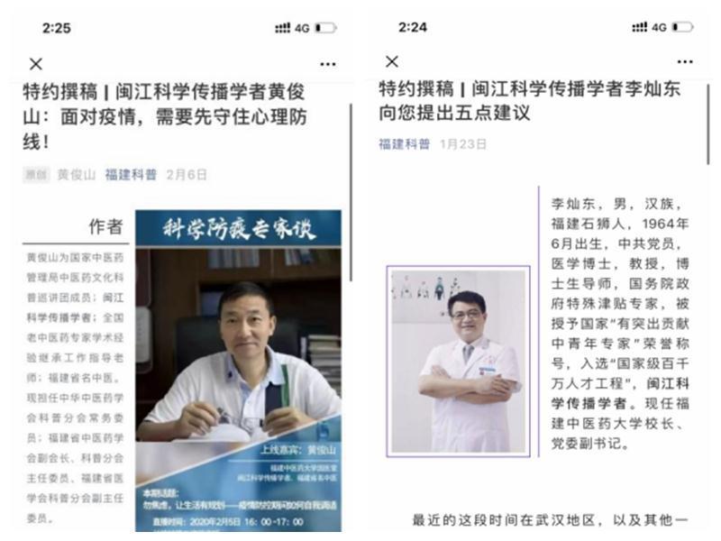 专家解惑,百姓收获。疫情期间,“福建科普”上线《特约撰稿》栏目,邀请由闽江科学传播学者组成的专家团队,以权威的科学知识为武器,及时发声,为我省广大群众“量身定制”疫情科普线上课堂,解疑释惑,稳定人心。目前已有9位学者累计供稿24篇,《李灿东:向您提出五点建议》《黄俊山:误判和恐慌是防控传染病的大敌!》等文章吸引众多平台粉丝持续关注、留言提问。