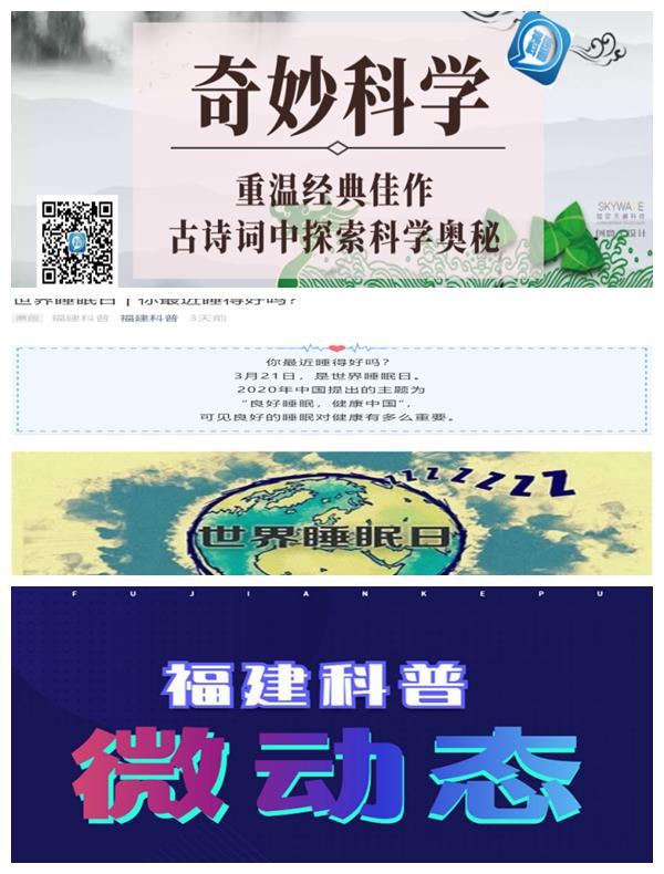3月10日,科普公众号首推全新栏目“诗说科学”,每周制作推送一期“古诗词中的奇妙科学”,用现代科学解读中国古典文化;3月21日,科普公众号首推“节日科普”,在“世界睡眠日”以图说科普的互动手法,引导大家充分领略“世界睡眠日”相关信息;3月23日,《福建科普微动态》如期上线,设计政策解读、创新记录、经典回顾等三个板块,帮助公众全面了解福建科普相关动态。