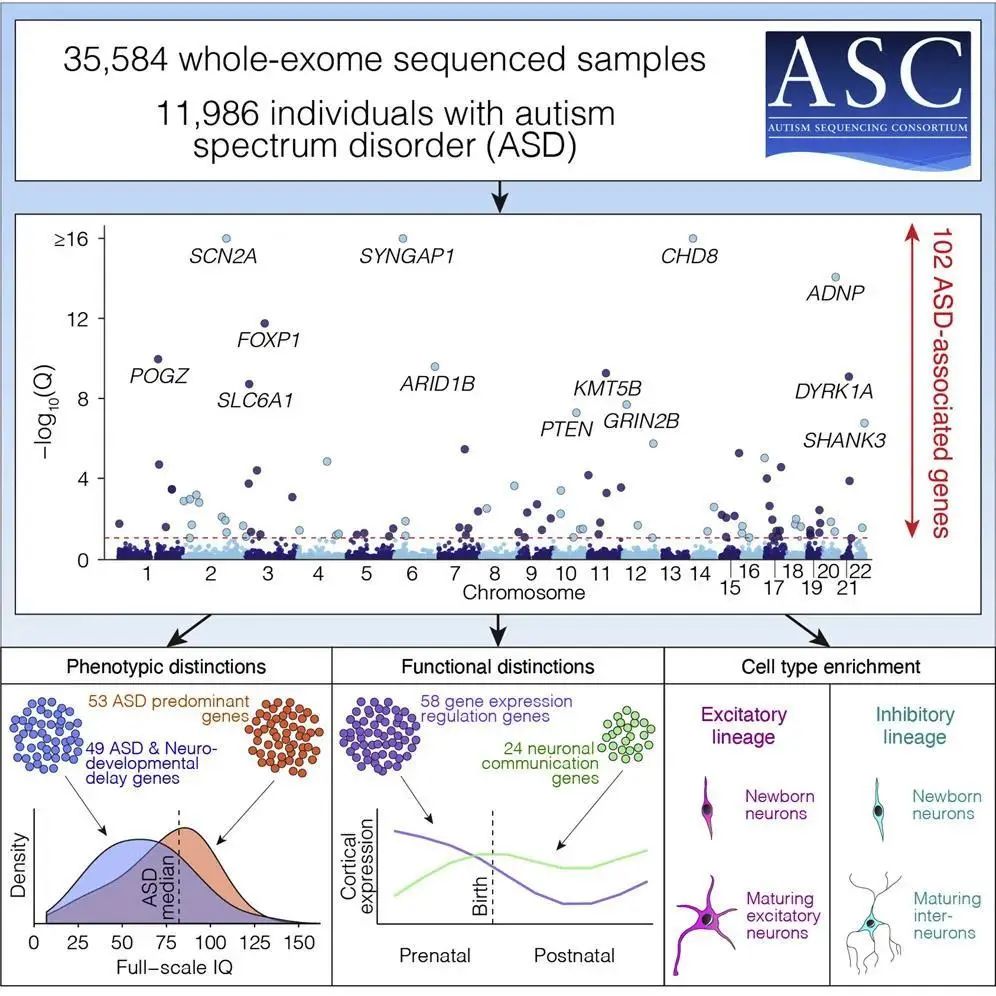 2020年2月,西奈山伊坎医学院领导的国际研究团队收集并分析 35,584 名参与者的样本,其中包括 11,986 名自闭症患者,完成了迄今为止最大规模的自闭症队列测序项目。研究人员利用外显子组测序分析鉴定到 102 个与自闭症风险相关的基因,其中有 49 个基因与神经发育迟缓症状有关。这项研究将自闭症相关基因的数量从2015年时的65个增加到目前的102个,并在区分自闭症与智力缺陷和发育迟缓相关基因方面取得重大进展。研究人员还发现,自闭症相关基因会影响脑部的发育和功能,这两种影响从而增加了自闭症的患病风险。