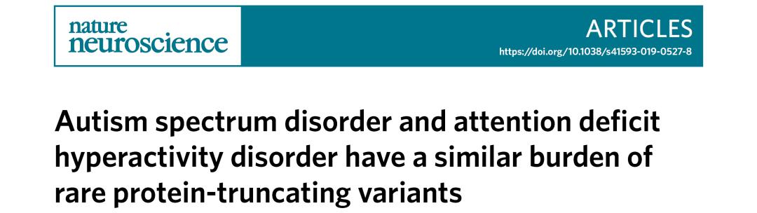 4. Satterstrom FK. Autism spectrum disorder and attention deficit hyperactivity disorder have a similar burden of rare protein-truncating variants. Nat Neurosci. 2019 Dec;22(12):1961-1965.