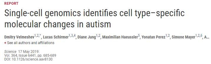 6. Velmeshev D. Single-cell genomics identifies cell type-specific molecular changes in autism. Science. 2019 May 17;364(6441):685-689.