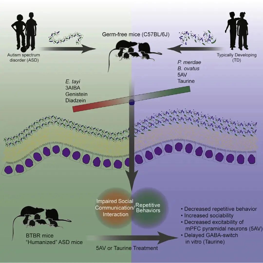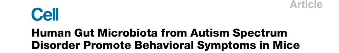 加州理工大学的研究人员通过粪便移植,将患有自闭症和正常发育儿童的肠道微生物分别移植到实验小鼠体内。其中,植入患有自闭症个体微生物种群的小鼠表现出类似自闭症症状的行为特征,如社交互动时间缩短、不发声、频繁出现重复性的行为,而植入正常发育个体肠道菌群的小鼠则没有表现出这些症状。除行为差异以外,植入自闭症儿童肠道微生物的小鼠大脑中的基因表达和代谢物组成也还发生了显著变化。由此推测,肠道菌群或是引发自闭症相关症状的重要因素。随后的微生物种群组成和行为相关性分析表明,特定肠道菌群组成改变与自闭症相关行为密切相关,由此证据证明特定细菌可能导致自闭症各种行为症状的假设。
