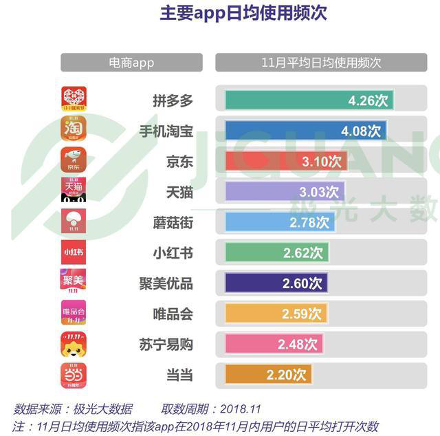 想要了解传统电商非计划性购物的短板,还有一个数据可参考,电商类应用人均使用时长普遍不算太高。根据极光大数据发布的《2018年电商行业研究报告》显示,用户使用拼多多和手机淘宝最为频繁,日均使用频次超过4次。京东和天猫用户日均使用3次左右,其它App使用频次均不到3次。
