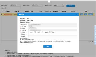 选择快递方式领取的申请单,填写收件信息。也可以合并填写快递单,勾选快递到同一地址的申请单,填写相同的收件信息,受理后会将合并的申请单对应的发票放在同一个快递中配送。