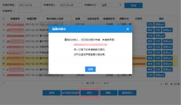 选择申请单,点击提交按钮,提示提交成功则可进入下一步。
