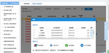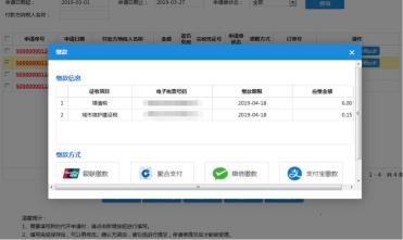 选择已提交的未缴款的申请单,点击缴款按钮,弹出缴款界面、展示该申请单的税费明细,选择缴款方式,系统支持银联缴款、聚合支付、微信缴款、支付宝等缴款方式。
