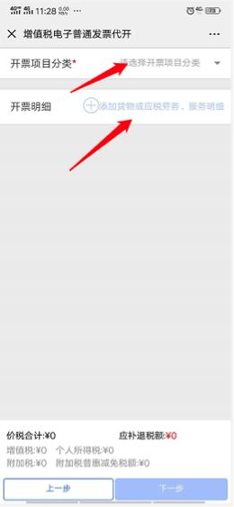 填写完基本信息点击“下一步”,填写开票项目明细,选择在“开票项目分类”后添加“货物或应税劳务、服务明细”,填写代开货物名称、单位、数量、单价等信息。