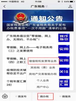 关注“广东税务”微信公众号——点击“微办税”——“增值税和发票等业务”。