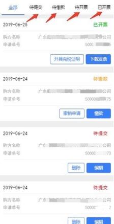 在基本信息填写下面,点击下方“全部申请”进入申请状态分类页面,可查询已申请代开电子发票的信息,并进行相应的操作。