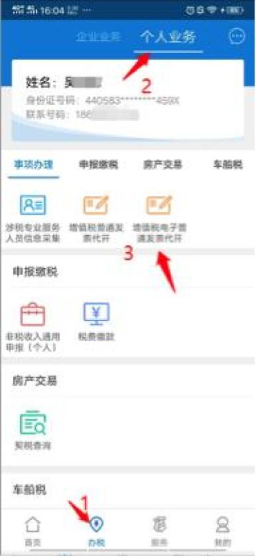 点击下方“办税”——切换最上方“个人业务”——事项办理“增值税电子普通发票代开”,进入到增值税电子普通发票代开申请。