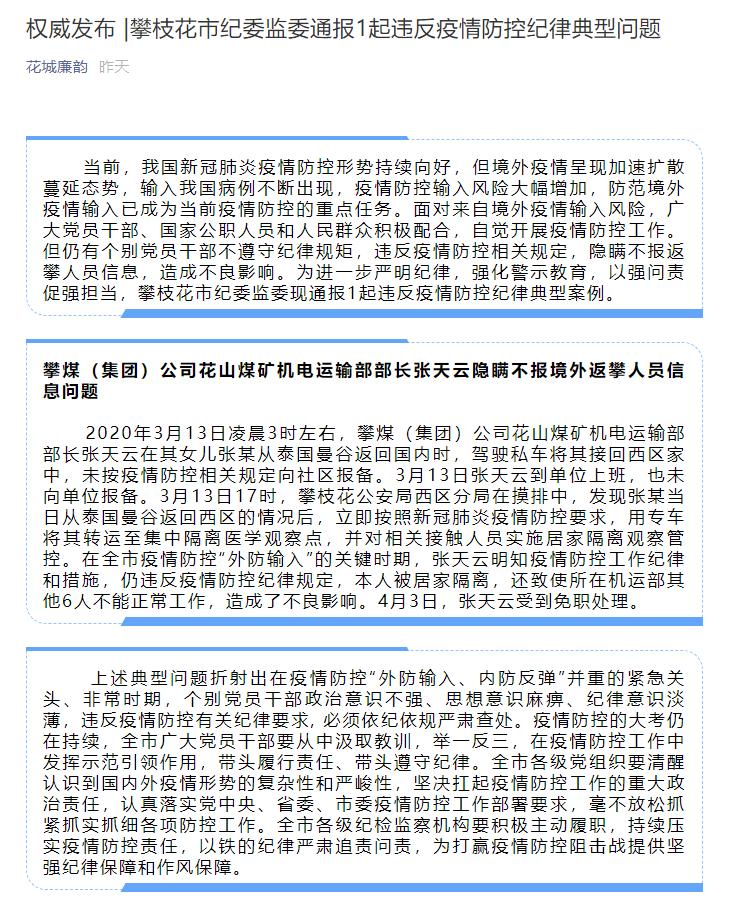 四川攀枝花纪委监委微信公众号3日发布通报称,攀煤(集团)公司花山煤矿机电运输部部长张天云在其女儿从泰国曼谷返回国内时,驾驶私车将其接回家中,未向社区报备,违反疫情防控纪律规定。4月3日,张天云受到免职处理。