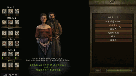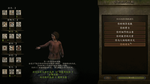 比如在游戏的一开始,你就可以选择自己的出身,你可以是贵族仆从、旅行商人、自由民、铁匠、猎人、雇佣兵。。。的儿子。
