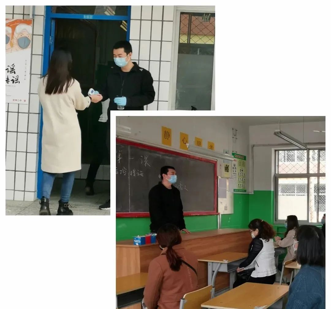 各班教师提前开窗通风,进行教室消毒。学生有序进入校园后,在带队老师的带领下有序进入教学区,学生单人单桌,每个座位间隔1米以上,教师上课或与学生谈话间隔应大于1米。教师依次进行二次体温测量,无异常情况后,全程佩戴口罩进行疫情防控开学第一课主题班会的学习。