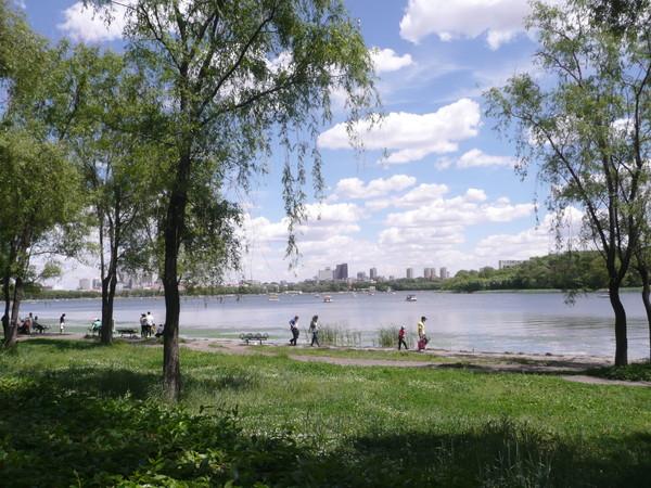 南湖公园很大,大到一片水域都要被园外的大马路分开,这边一半,那边一半,湖上有不少游船在泛舟,湖岸上的草坪扎满了帐篷,不少人会在那里野餐。