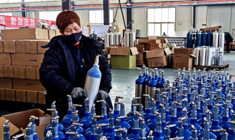 开发区洁能科技有限公司工作人员包装医用氧气瓶驰援武汉