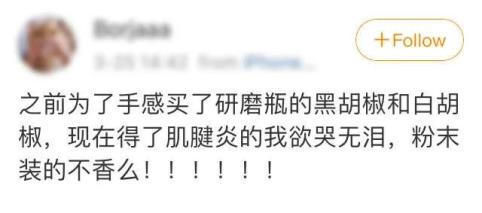 在中产们看来,研磨黑胡椒除了在口感上更胜一筹,还让做饭变得更有操作感。至于具体啥是操作感,只能意会,不能言传。