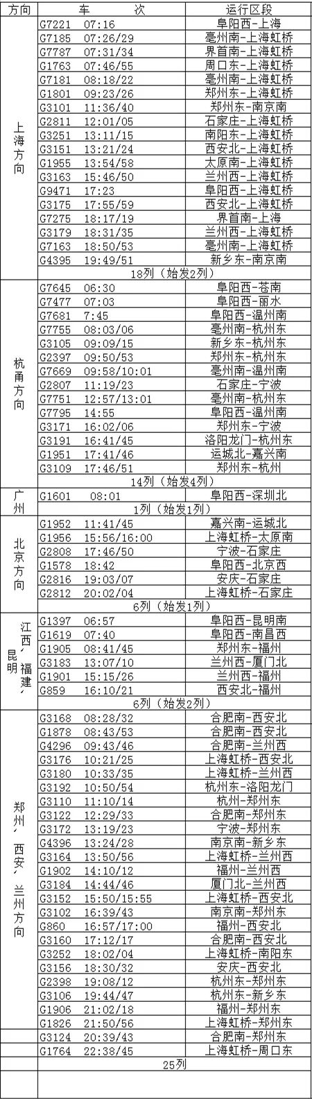 有7趟途径阜阳西站的高铁列车停运,具体为: