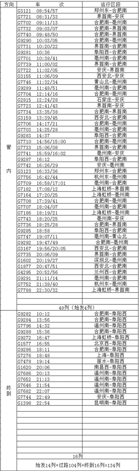2.合肥南-亳州南G9292次列车,阜阳西站19:47到达,19:49开车;