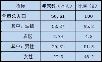年末全市常住总人口56.61万人,比上年增加0.28万人,其中城镇人口53.87万人,城镇人口比重95.2%,农区人口2.74万人;男女性别比107.36(以女性为100);全年出生人口0.49万人,出生率8.71‰,死亡人口0.25万人,死亡率4.41‰,自然增长率4.3‰。