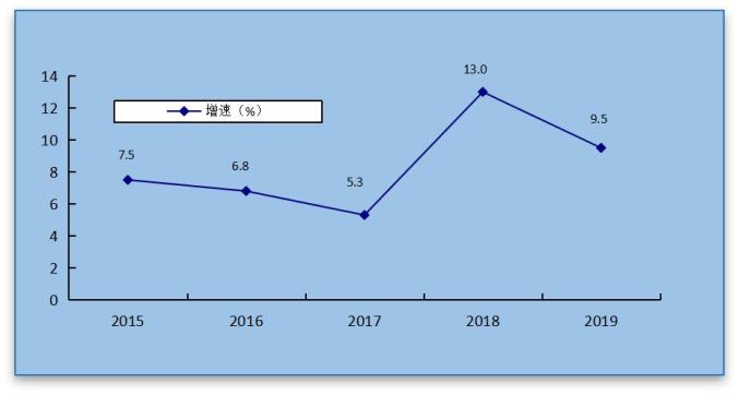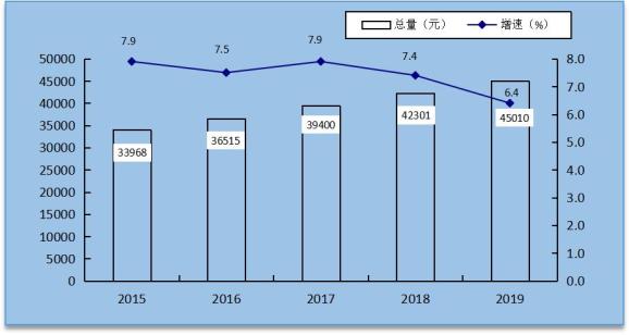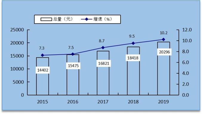 图8:2015—2019年城镇常住居民人均可支配收入及其增速