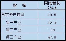 全年固定资产投资总额同比增长10.5%。其中,第一产业投资同比增长12.4%,第二产业投资同比下降19.0%,第三产业投资同比增长47.8%。三次产业投资比重为0.5:40.7:58.8。