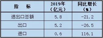 全年进出口总额达5.8亿元,同比下降21.2%。其中出口额5.2亿元,同比下降26.5%;进口额0.6亿元,同比增长116.1%。