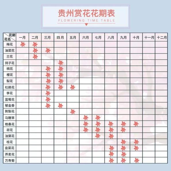 一月梅花扑鼻香,二月迎春伸出墙,三月油菜花遍野,四月杜鹃满山冈,五月珙桐随风摆,六月薰衣草海洋,七月荷花别样红,八月桂花甜又香,九月韭菜坪花开,十月菊花爱秋风,十一山茶初开放,十二腊梅傲风霜!