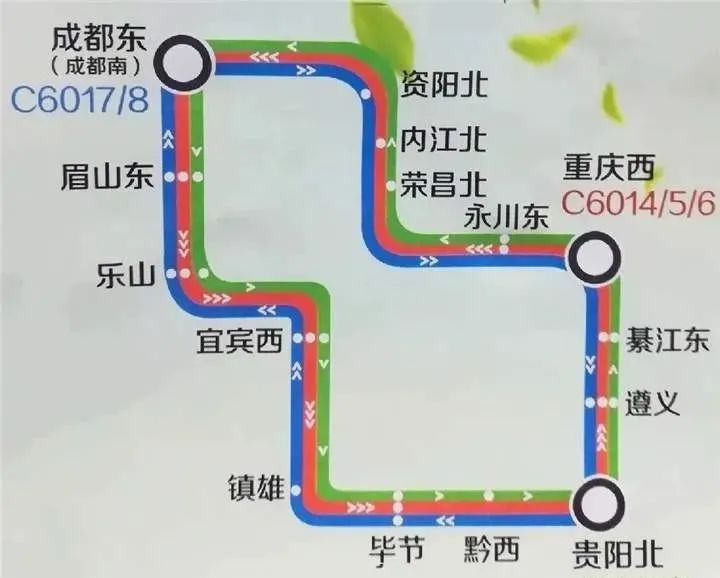 开行贵阳北至贵阳北环线动车C6012次,列车呈逆时针方向经由渝贵铁路、成渝高铁、成贵高铁运行,贵阳北站10:50发车,依次经停遵义、綦江东、重庆西、永川东、荣昌北、成都南、眉山东、乐山、宜宾西、毕节、黔西等11站,18:42抵达贵阳北,全程历时7小时52分。