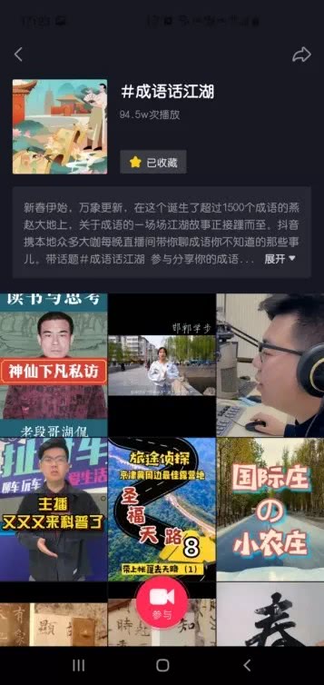 2.点击左上角扫一扫-相册扫描话题二维码;或直接在搜索框搜索#成语话江湖 进入话题