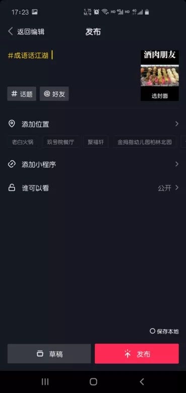 4.添加文案及话题#成语话江湖 ,设置视频封面和定位,发布视频
