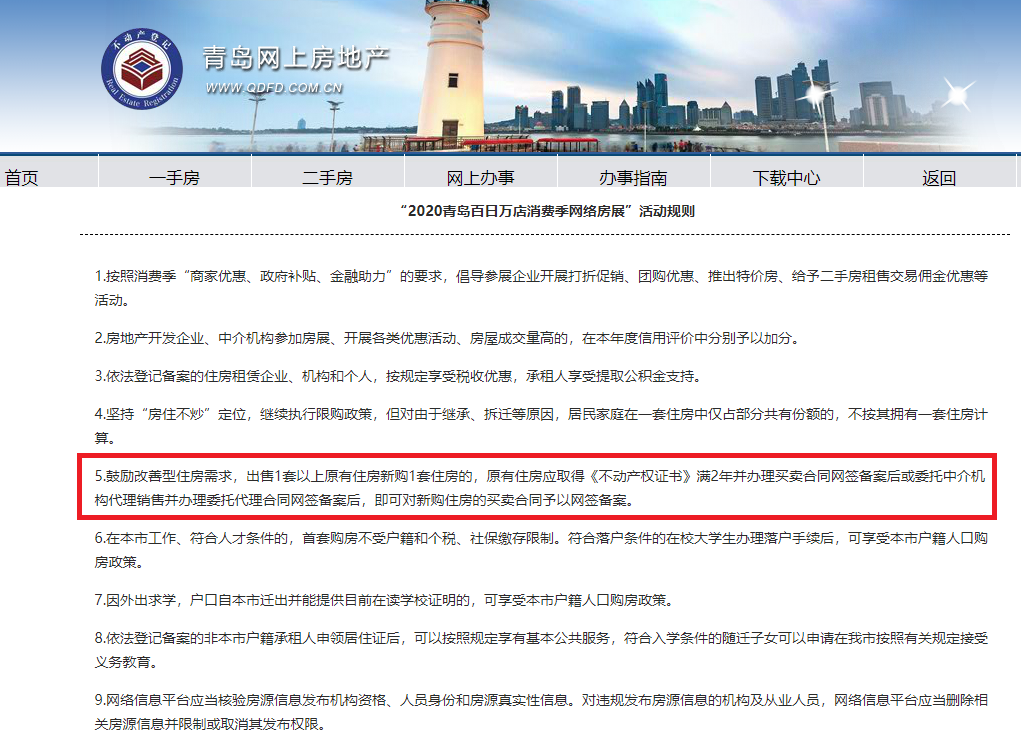 由山东省青岛市不动产登记中心主办的青岛网上房地产网站发布“2020青岛百日万店消费季”活动规则显示,鼓励改善型住房需求,出售1套以上原有住房新购1套住房的,原有住房应取得《不动产权证书》满2年并办理买卖合同网签备案后或委托中介机构代理销售并办理委托代理合同网签备案后,即可对新购住房的买卖合同予以网签备案。