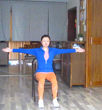 坐于椅面,腰背直立,双手背后十指互扣,掌心向上。腹肌上提,背阔肌向身体中线靠拢,向下用力,胸腔展开。