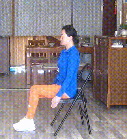 坐于椅面前端,腿外侧与髋同宽,双脚压实地面,腰背直立。右腿向前伸出,足跟向下、向前推地,脚掌回勾。大腿前侧肌肉上提,髋关节前屈,伸展大腿后侧肌群。