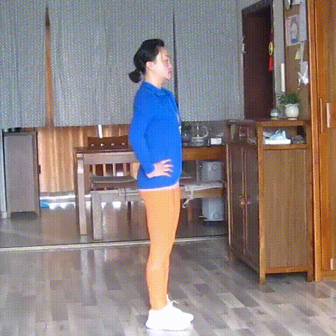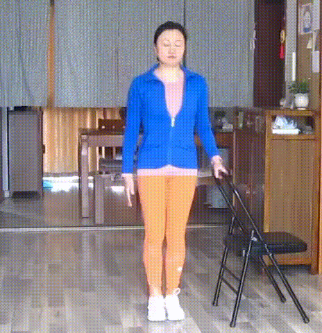 并腿站立,腰背直立,左手扶椅帮助稳定。右膝屈曲,脚掌回勾,右手握住右脚踝,向上用力,右腿向下用力,提腹肌向上。