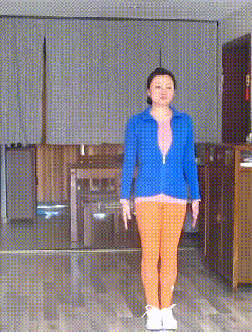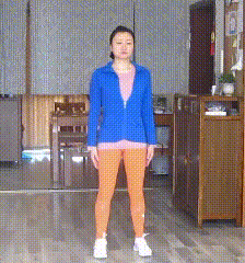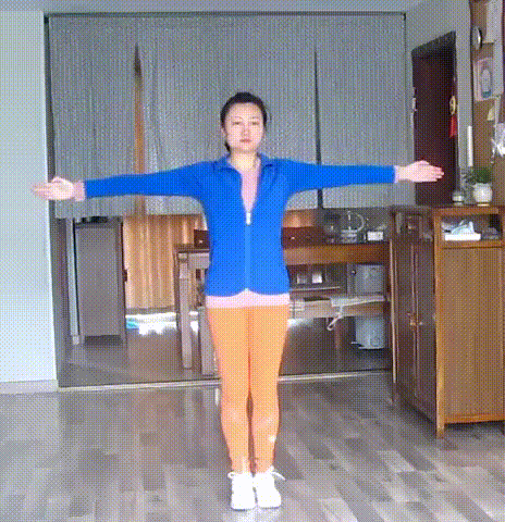 并腿站立,腰背直立,双手侧平举,掌心向前。自髋关节扭转躯干,右臂靠向左臂,躯干缓慢转回。