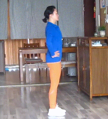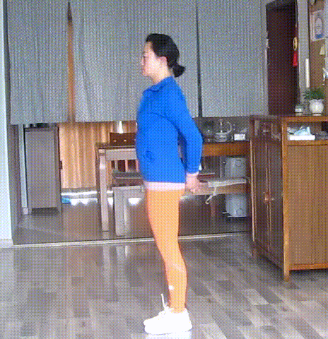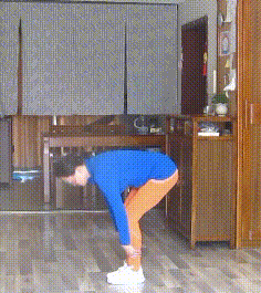 并腿站立,屈膝,髋关节前屈,腹部落于大腿前侧,双手支撑于脚踝或双脚两侧,缓慢提臀部向上,屈膝慢慢站起。