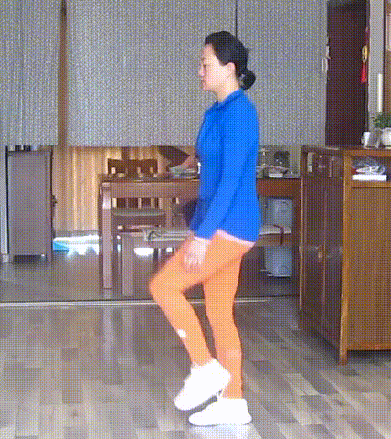 并腿站立,腰背直立,右腿向前伸出,足跟向下、向前推地,脚掌回勾。大腿前侧肌肉上提,髋关节前屈,伸展大腿后侧肌群。