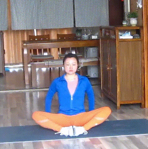 坐于椅面,屈膝收腿,双脚掌内外侧保持互推,提腹肌向上,保持腰背直立。双手握住脚趾,十指互扣,髋关节前屈,小臂与大、小腿内侧互推。