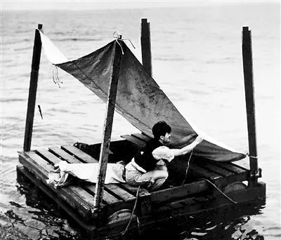 在无际的大海上,除了翻滚的海浪什么也没有。五天过去了,潘廉开始意识到情况的严重性,他清点了救生筏上的食物和淡水,做好了长期漂流海上的打算。第六天上午,一艘美国军舰突然出现,潘廉用尽力气呼救。军舰上的美国士兵也发现了潘廉的小木筏,但他们一边用手指指点点,一边哈哈大笑,嘲笑潘廉狼狈的模样,有的士兵还举起步枪恐吓潘廉,最后军舰扬长而去。获救的希望破灭了,潘廉只有继续漂流,他把木筏上的水和食物进行了精细规划,每天只吃最少的食物和淡水。五十多天后,仅有的食物和淡水全部耗尽。为了活下去,潘廉决定自力更生,他将一张帆布倾斜搭在救生筏上,白天可以遮挡太阳,晚上可以吸引海鸟在上面栖息,然后寻找机会将休息的海鸟捉住用来当食品,雨天则可以使雨水顺着帆布流蓄水罐中。他还利用麻绳制成钓鱼线,用折断的弹簧做成鱼钩,又用铁钉做了一把鱼叉。这样,他靠着捕捉到的海鸟和钓到的鱼,基本上可以维持生命了。吃的问题能基本解决了,但喝的淡水只能听老天爷决定,有时好长时间不下雨,他不得不喝自己的尿液来解渴。虽然生吃鱼肉、喝鱼血,很难下咽,可为了活下去,潘廉只好捏着鼻子强吞。