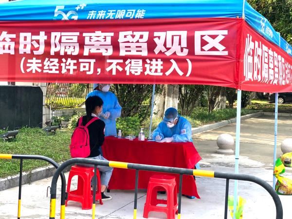 发现学生发热后,学校工作人员立即将该同学引导到临时隔离区,用水银体温计测量腋温并询问临床症状、流行病史和旅居史,填写《学校校医室就诊师生筛查登记表》;经二次测量体温值超过37.3度,临时隔离区医生立即向卫生所负责人报告,卫生所负责人接到报告立即向惠州学院防疫领导小组报告,防疫领导小组随即电话报告惠城区河南岸学府社区。