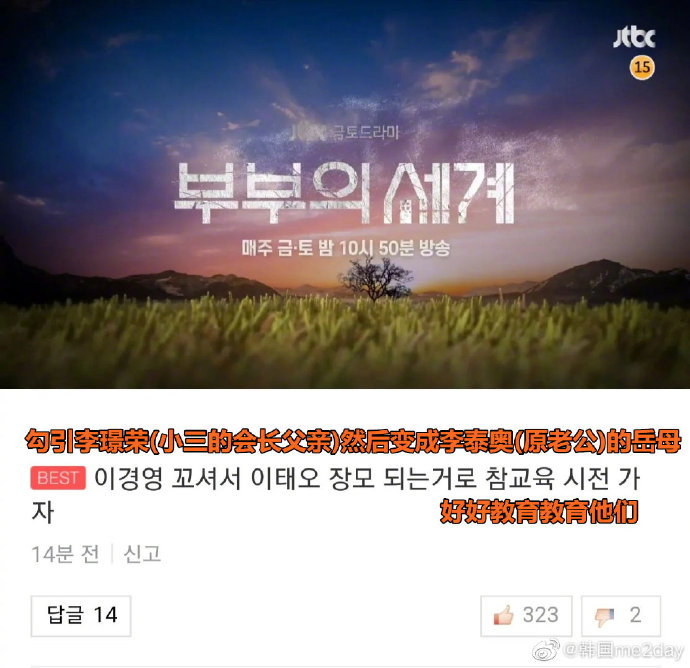 无论事业上多么成功的女性,她在社会上的价值体现,评判其是否属于“人生胜利组”的标准,始终不能逃离“身边的男人值几分”。就连韩网推荐的女主复仇计划,也包括勾引小三的父亲,摇身一变成岳母。这个看似搞笑的提议背后,折射的仍然是对男权的认同感,仿佛只有傍上一个更有权有势的男人,女主才能得到真正意义上的成功。这个现象本身不意外,可是对女性着实不公平,而当今的社会,你又很难说该如何去纠正这种不公平,最终都成了温水煮青蛙,从早前热映的电影《82年生的金智英》也可窥见一二。
