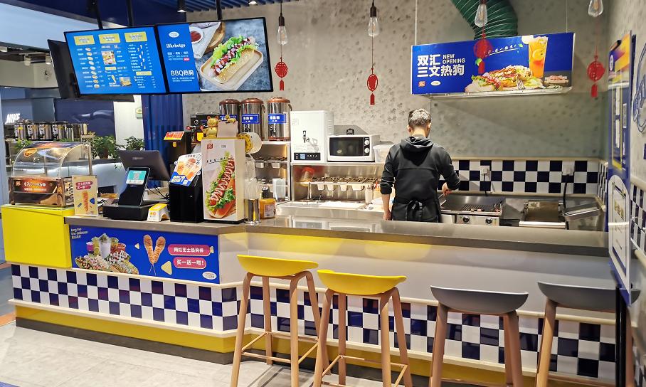记者留意到,受疫情影响,商场内人迹寥寥。虽已到午餐时间,但这家双汇三文热狗店鲜有人问津。不过在餐饮行业正值寒冬的当下,这家门店前却在显眼位置摆出了招聘信息牌,招聘人员从店员到店长,给予薪酬待遇每月3000元到6500元不等。