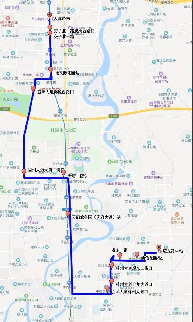 线路走向:应龙路中发出,经应龙路、应龙南二路、观东一街、梓州大道辅道(调头)、会龙大道、天府大道、天府二街、益州大道、锦城大道、交子南一路、天晖路、行至天晖路南