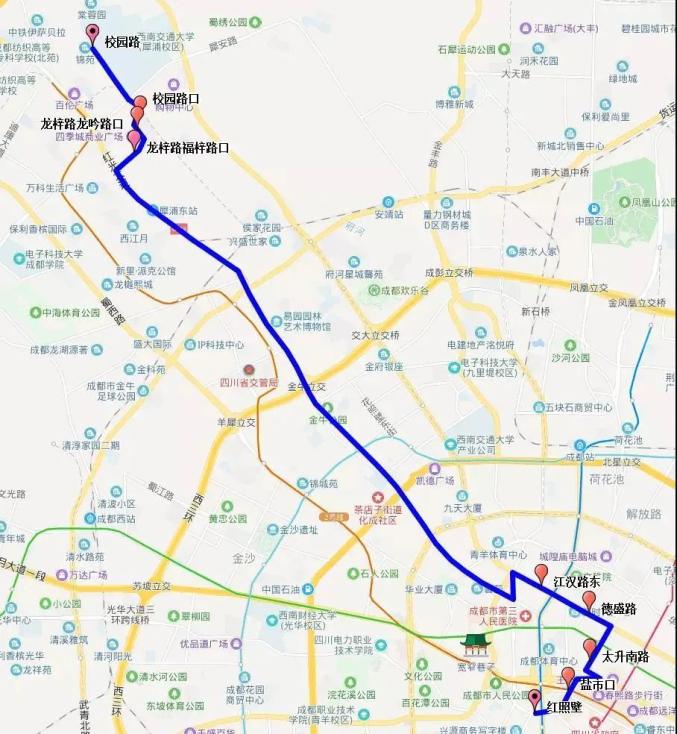 线路走向:校园路站发出后,经校园路、龙吟路、龙梓路、福梓路、红光大道、金牛大道牛坝路、西月城街、宁夏街、新华大道江汉路、太升南路、提督街、蜀都大道总府路、顺城大街、新华光街,行至红照壁站