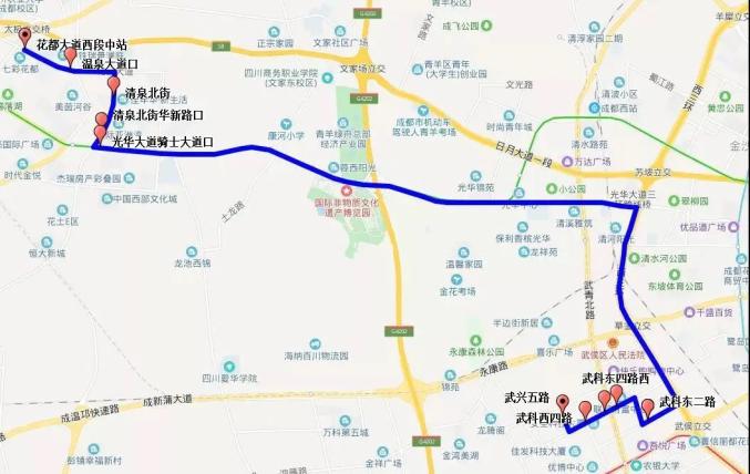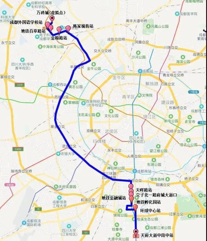线路走向:万科城(虚拟点)发出后,经天辰路、百草路、金粮路、红光大道、金牛大道牛坝路、三环主路、天晖路、锦城大道、益州大道、锦悦西路路、天府大道主路、行至天府大道中段中站
