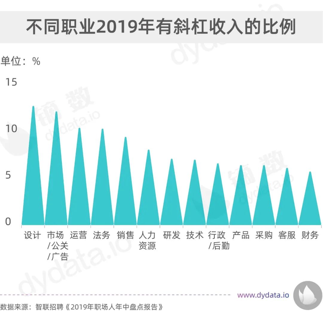当然,对于不同职业来说,是否有斜杠收入比例也有差异。《2019年职场人年终盘点报告》显示,有杠杆收入比例排行前三的主要是,设计行业13%,市场/公关/广告12.4%,运营10.6%。而排名后几位的则是采购6.5%、客服6.2%、财务5.8%。